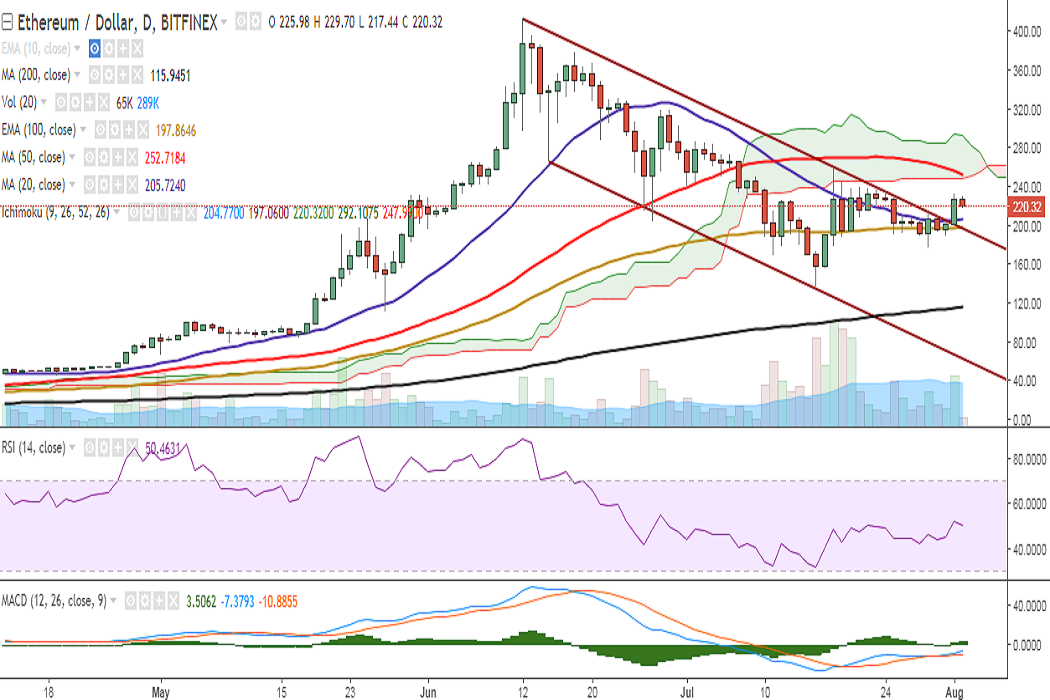 ETH/USD successfully closed above 55-EMA on Tuesday at 225 levels after it breached channel top. It is currently trading at 219 levels at the time of writing (Bitfinex).