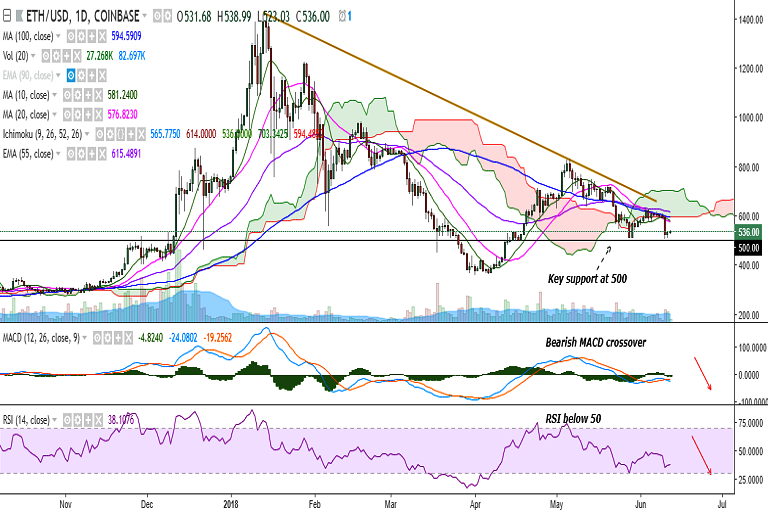 ETH/USD is consolidating in a narrow range on Tuesday and trading at 535 levels at the time of writing (Coinbase).