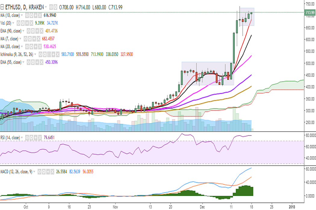 ETH/USD is trading in a close range on Monday as it tries to hold above 7-DMA. It is currently trading at 710 levels at the time of writing (Kraken).