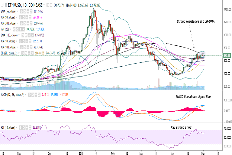 ETH/USD continues to consolidate in a narrow range with its upside capped by 100-DMA. It is currently trading at 678 levels at the time of writing (Coinbase).