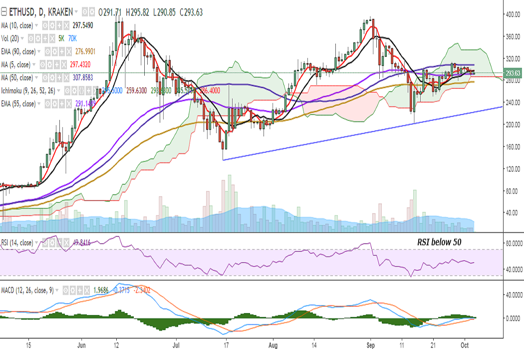 ETH/USD is trading in a narrow range on Wednesday as it continues to consolidate inside the Ichimoku cloud. It is currently trading at 295 levels at the time of writing (Kraken).