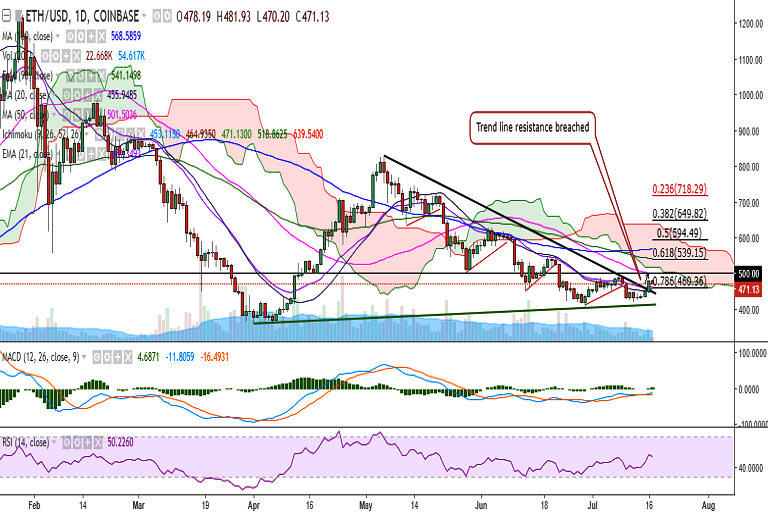 ETH/USD is rangebound on Tuesday and trading at 471 levels at the time of writing (Coinbase).
