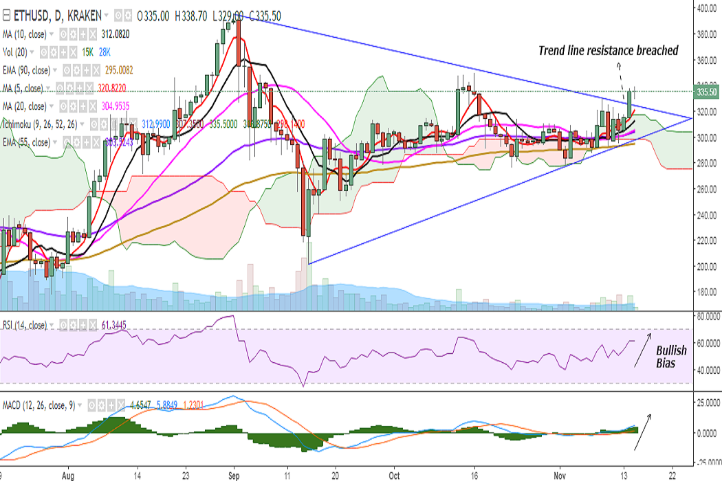 ETH/USD is trading in a narrow range on Wednesday and has hit 338 levels so far in the day. It is currently trading at 335 levels at the time of writing (Kraken).