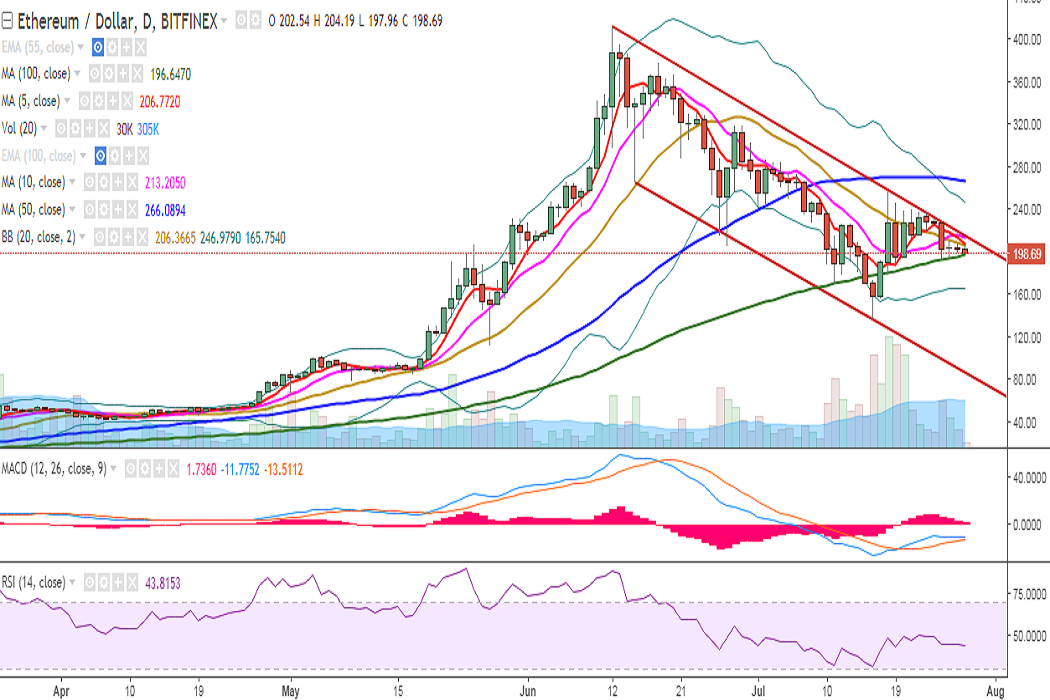 ETH/USD is continuing its choppy trade on Friday. It is currently trading at 199 levels at the time of writing (Bitfinex).