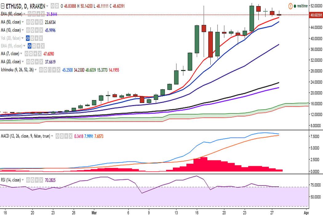 ETH/USD continues trading in a narrow range on Tuesday, between 48 and 50 levels. It is currently trading at 49 levels at press time (Kraken).