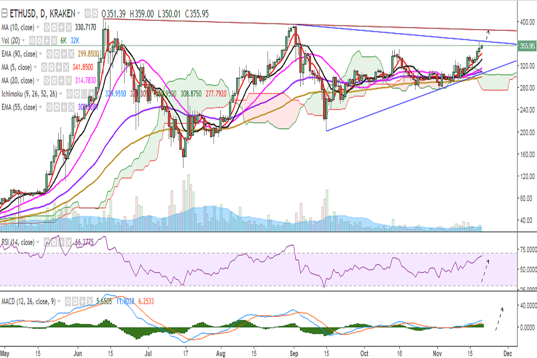 ETH/USD broke above the trend line joining 349.50 and 338.70 and hit 364 levels on November 19. It is currently trading at 356 levels at the time of writing (Kraken).