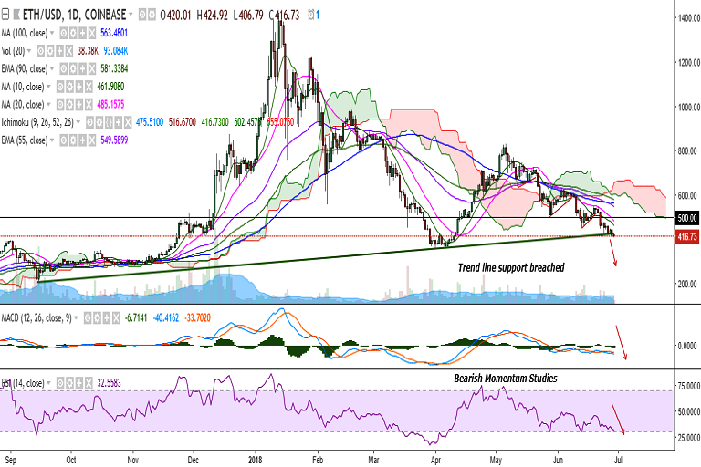 ETH/USD continued its downtrend on Friday and dropped to near 400 levels. It is currently trading at 415 levels at the time of writing (Coinbase).