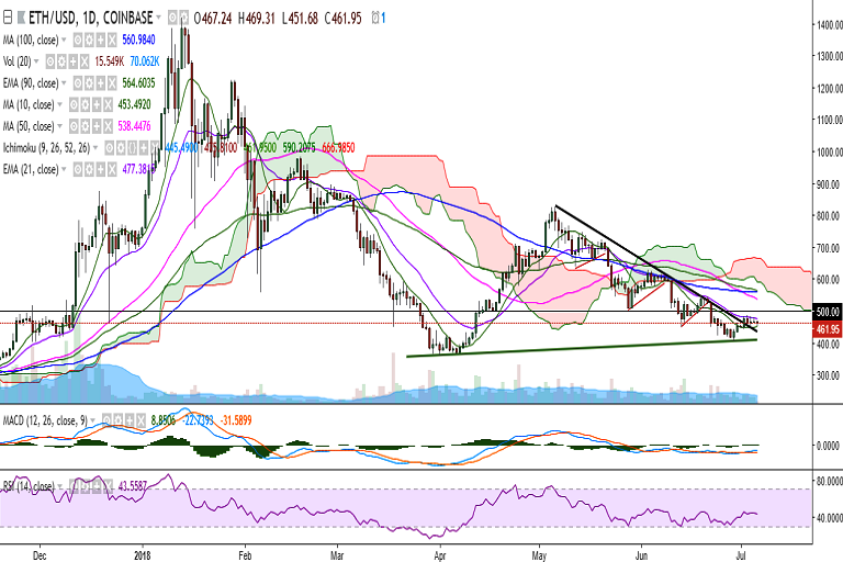 ETH/USD remains largely flat on Friday with its upside capped by 21-EMA. It is currently trading at 459 levels at the time of writing (Coinbase).