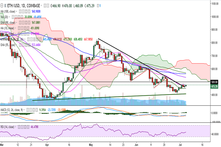 ETH/USD continues to consolidate in a narrow range below 500 levels on Thursday. It is currently trading at 474 levels at the time of writing (Coinbase).