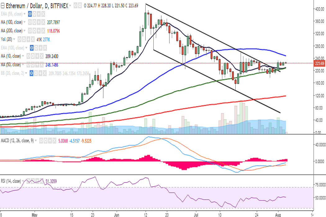 ETH/USD remains rangebound on Friday as it fails to pick any significant upward momentum following the channel breakout. It is currently trading at 225 levels at the time of writing (Bitfinex).