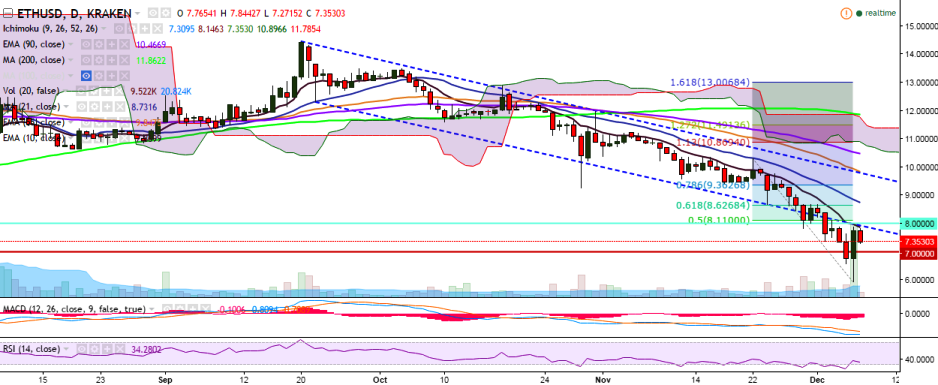 ETH/USD broke below the 6.00 mark on Tuesday and hit a 9-month low of 5.92 levels. However, it restored strength and closed 7.75 levels. It is currently trading at 7.33 levels at the time of writing (Kraken).