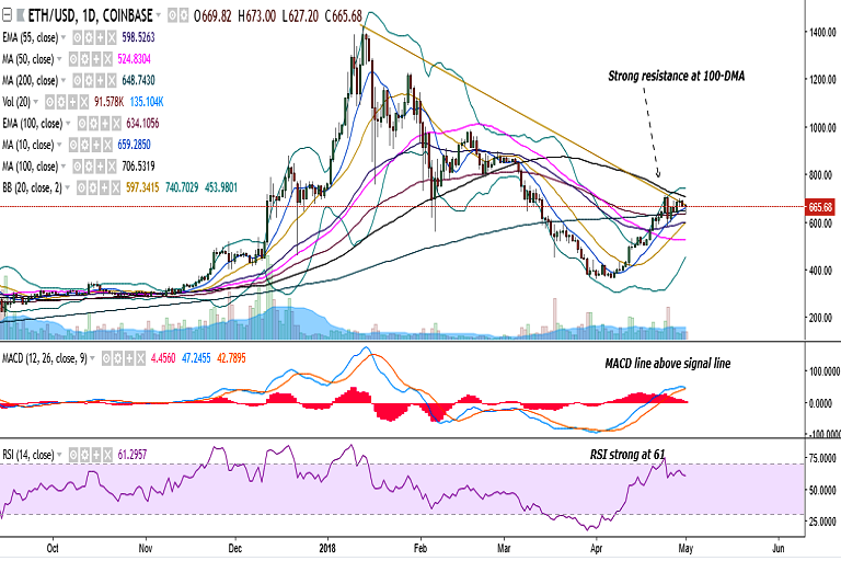 ETH/USD is trading lower on Tuesday as it struggles to hold above trend line joining 1419.96 and 711. It is currently trading at 667 levels at the time of writing (Coinbase).