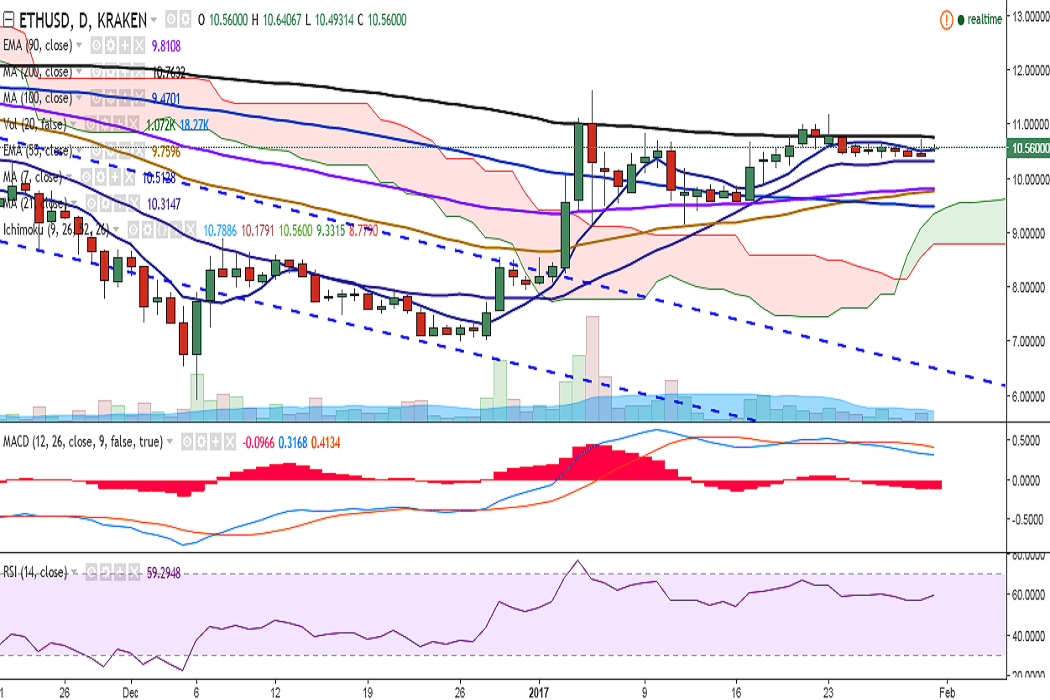 ETH/USD failed to break above 200-DMA once again as it hit 10.72 levels on Monday. It is currently trading at 10.56 levels at press time (Kraken).
