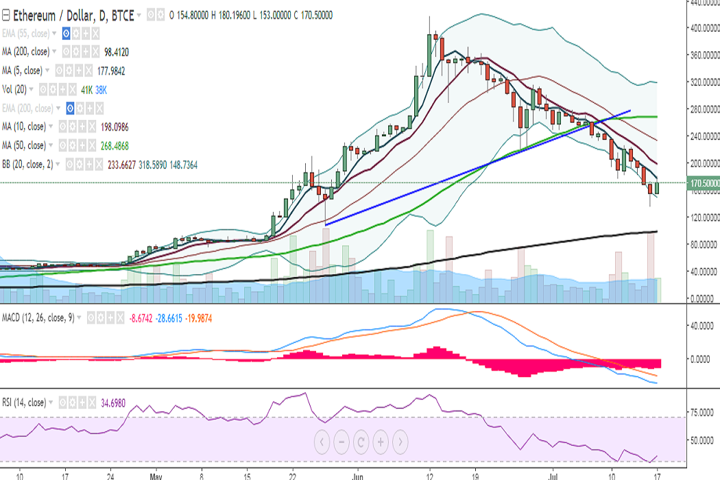 ETH/USD plunged to 134 levels on July 16 after it broke below 100-DMA. It is currently trading at 173 levels at the time of writing (BTC-e).