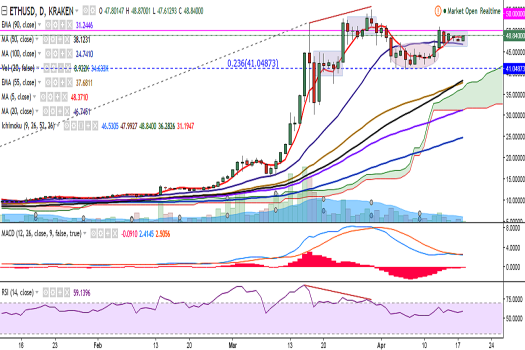 ETH/USD continues rangebound trading on Tuesday as it faces stiff resistance at 50.00 levels. It is currently trading at 48 levels at the time of writing (Kraken).