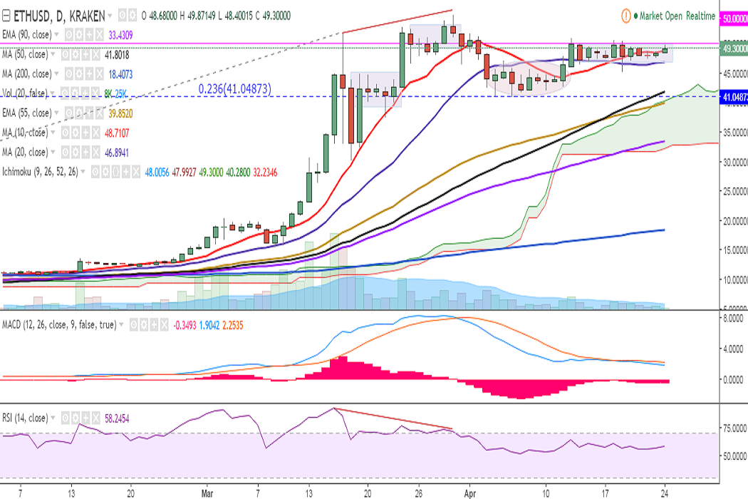 ETH/USD continues rangebound trading on Monday as its upside is capped by the 50.00 mark. It is currently trading at 49 levels at the time of writing (Kraken).