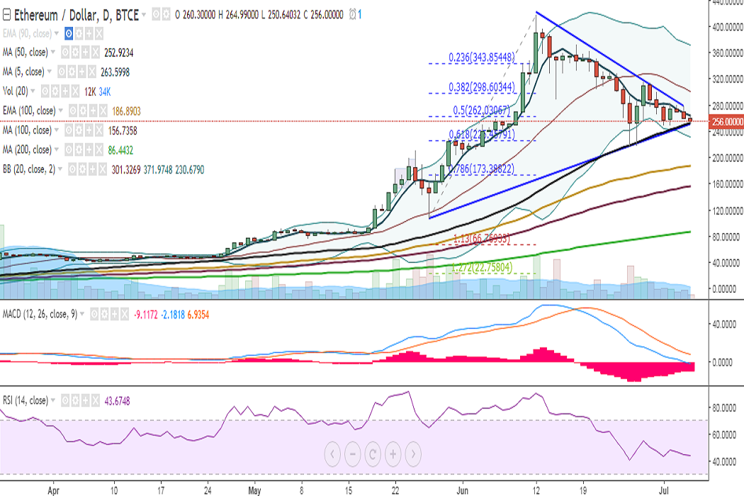 ETH/USD continues trading in the red in a narrow range on Wednesday as the pair trades in a symmetrical triangle pattern. It is currently trading at 251 levels at the time of writing (BTC-e).