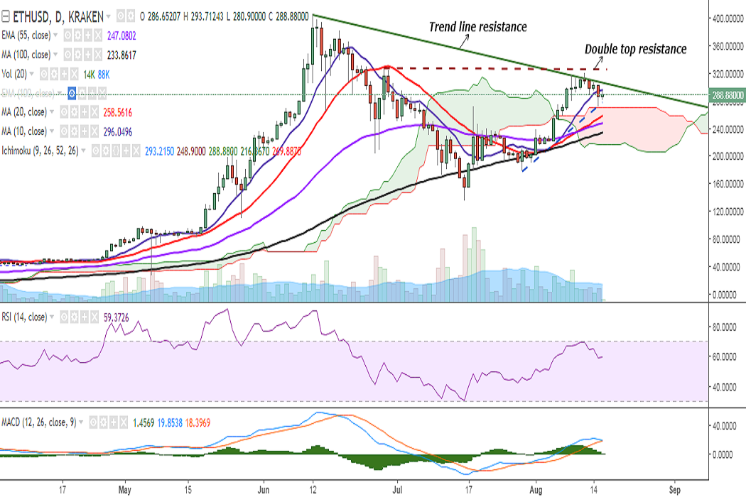 ETH/USD is trading in a narrow range on Wednesday after it fell to 271 levels on August 15. It is currently trading at 287 levels at the time of writing (Kraken).
