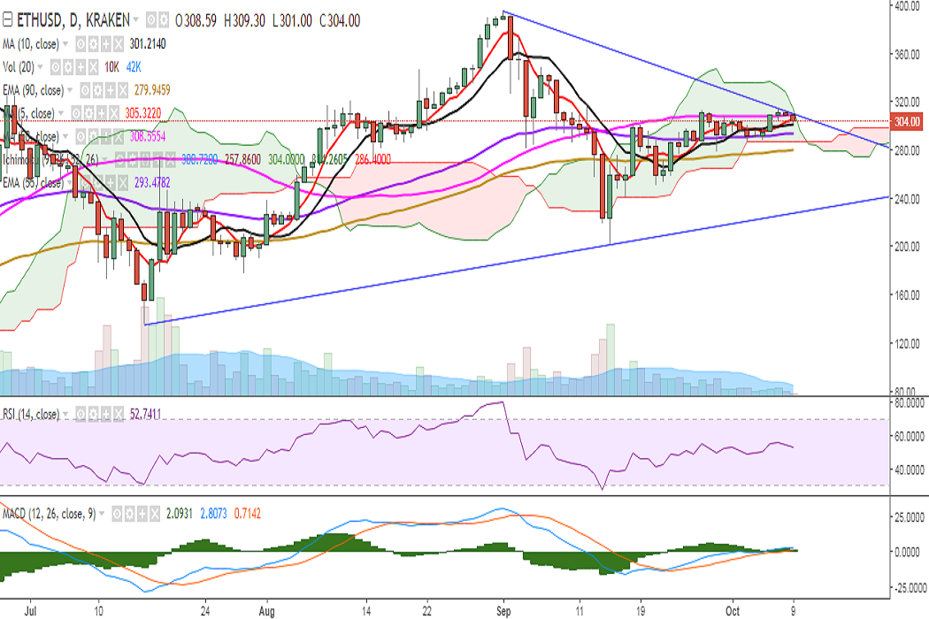 ETH/USD continues to consolidate inside the Ichimoku Cloud as its upside is capped by the trend line joining 395 and 314. It is currently trading at 303 levels at press time (Kraken).