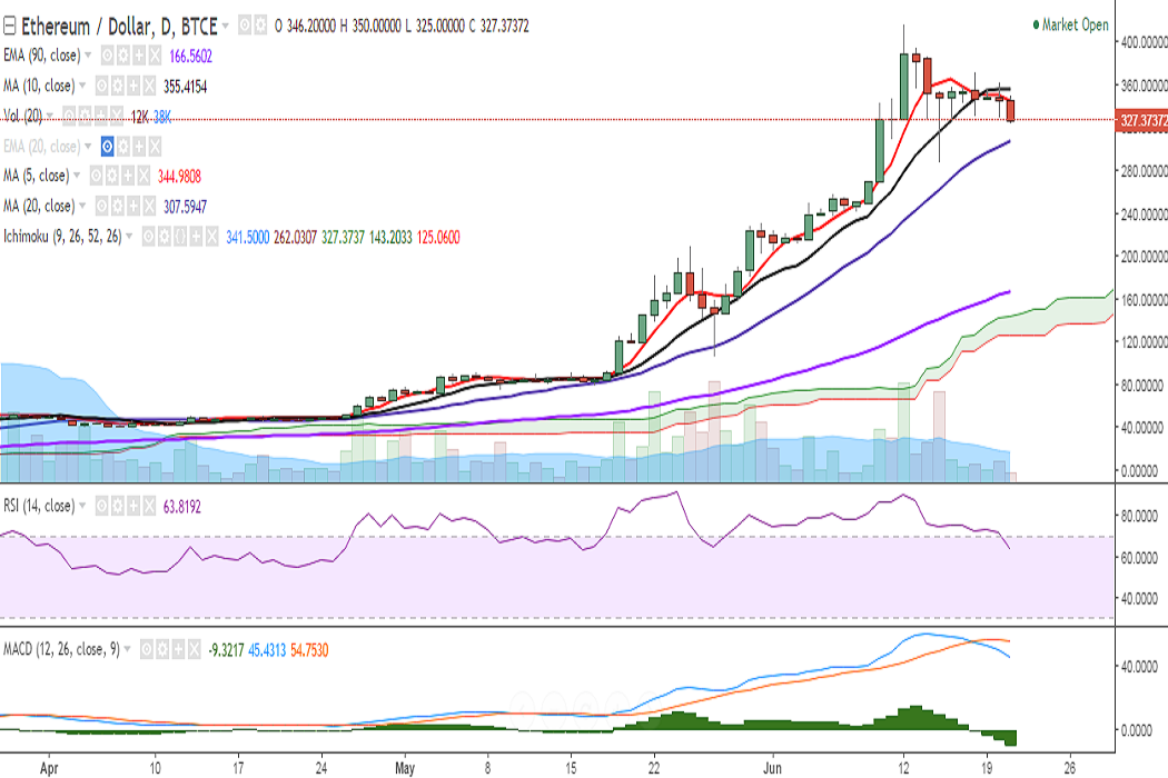 ETH/USD failed to close above 10-DMA and is trading deep in the red on Wednesday. It is currently trading at 328 levels at the time of writing (BTC-e).