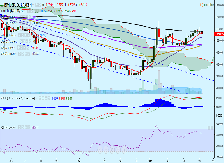 ETH/USD hit a high of 11.19 levels on Monday, but failed to sustain its move. It is currently trading at 10.58 levels at press time (Kraken).