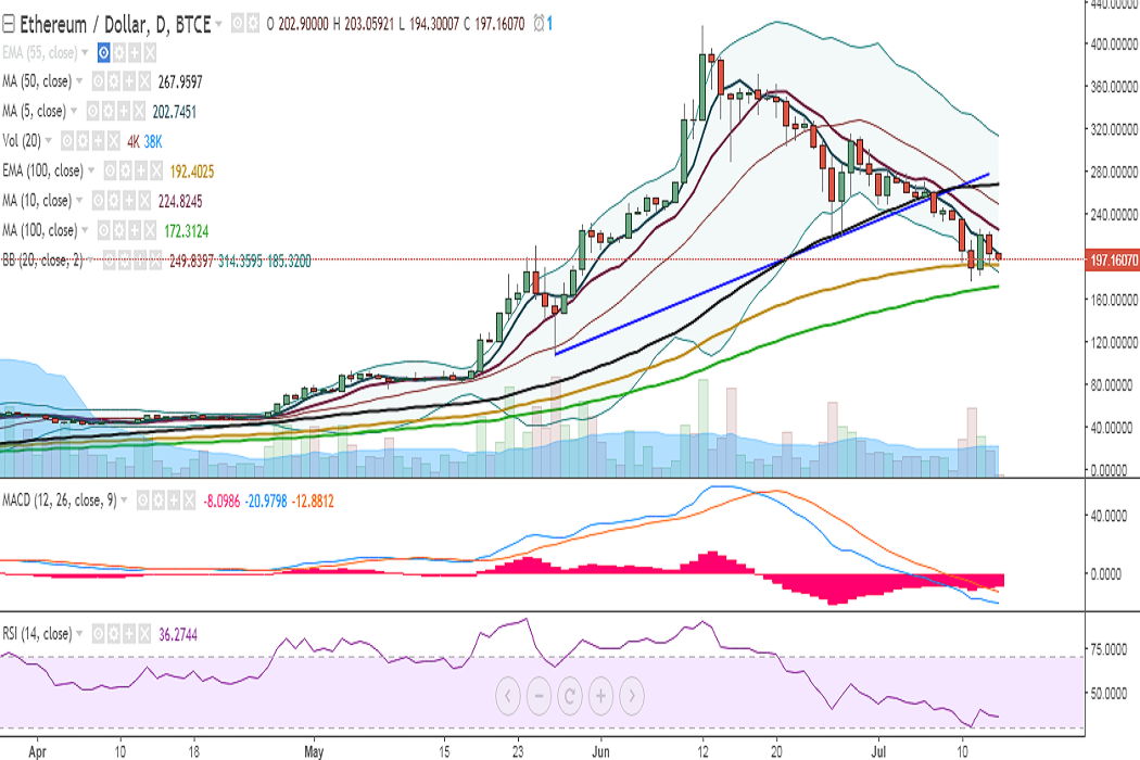 ETH/USD failed to hold above 5-DMA and closed at 202 levels on Thursday. It is currently trading at 197 levels at the time of writing (BTC-e).