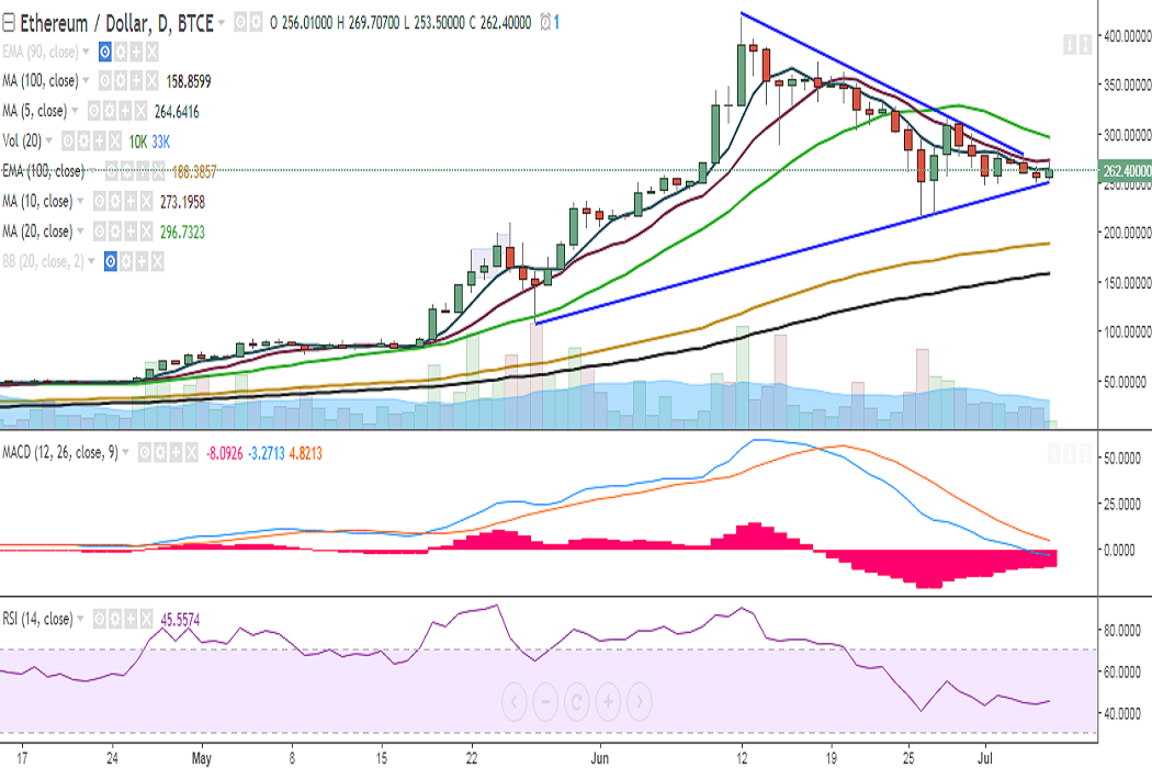 ETH/USD continues trading in a narrow range on Thursday as its upside is capped by 10-DMA. It is currently trading at 265 levels at the time of writing (BTC-e).