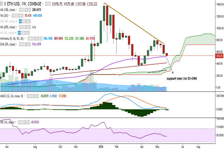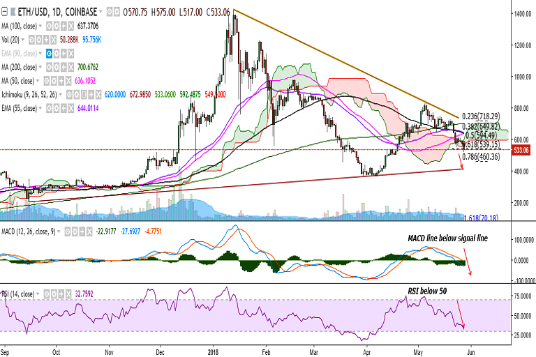 ETH/USD has broken below 61.8% retracement of 360 and 828.97 and currently trading at 527 levels at press time (Coinbase).