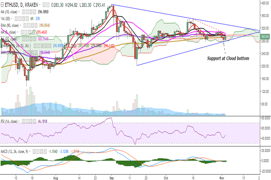 ETH/USD reversed its losses on Friday as it found strong support near Cloud bottom. It is currently trading at 292 levels at the time of writing (Kraken).