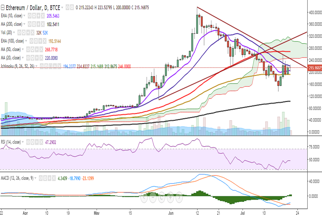 ETH/USD is struggling for a consistent break above 20-DMA and is currently trading at 214 levels at the time of writing (BTC-e).