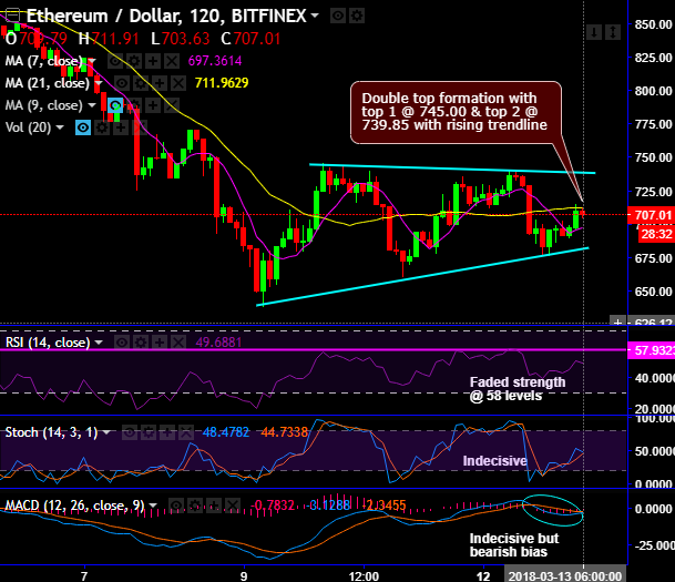 ETHUSD forms the double top pattern on intraday chart plotting with top 1 at 745.00 & top 2 at 739.85 with rising trend line (refer 2H chart).