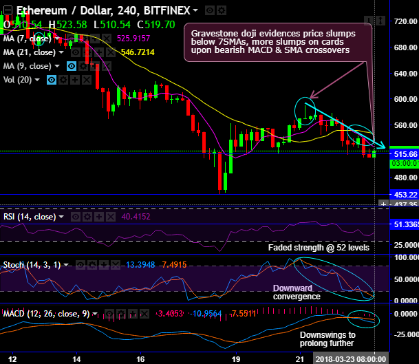 ETHUSD forms gravestone doji pattern candlestick on intraday plotting at 570.03 levels, consequently, this bearish pattern evidences price slumps below 7SMAs, more slumps on cards upon bearish MACD & SMA crossovers (refer 4H chart).