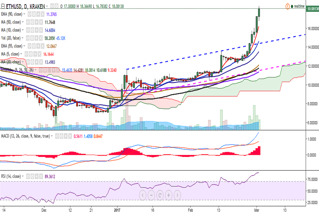 ETH/USD soared higher on new found strength on Thursday and hit a fresh 8-month high of 18.36 levels (Kraken). It is currently trading at 18.07 levels at press time.