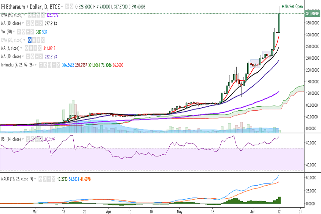 ETH/USD surged higher on Monday and has hit a fresh all-time high at 415 levels so far in the day. It is currently trading at 391 levels at the time of writing (BTC-e).