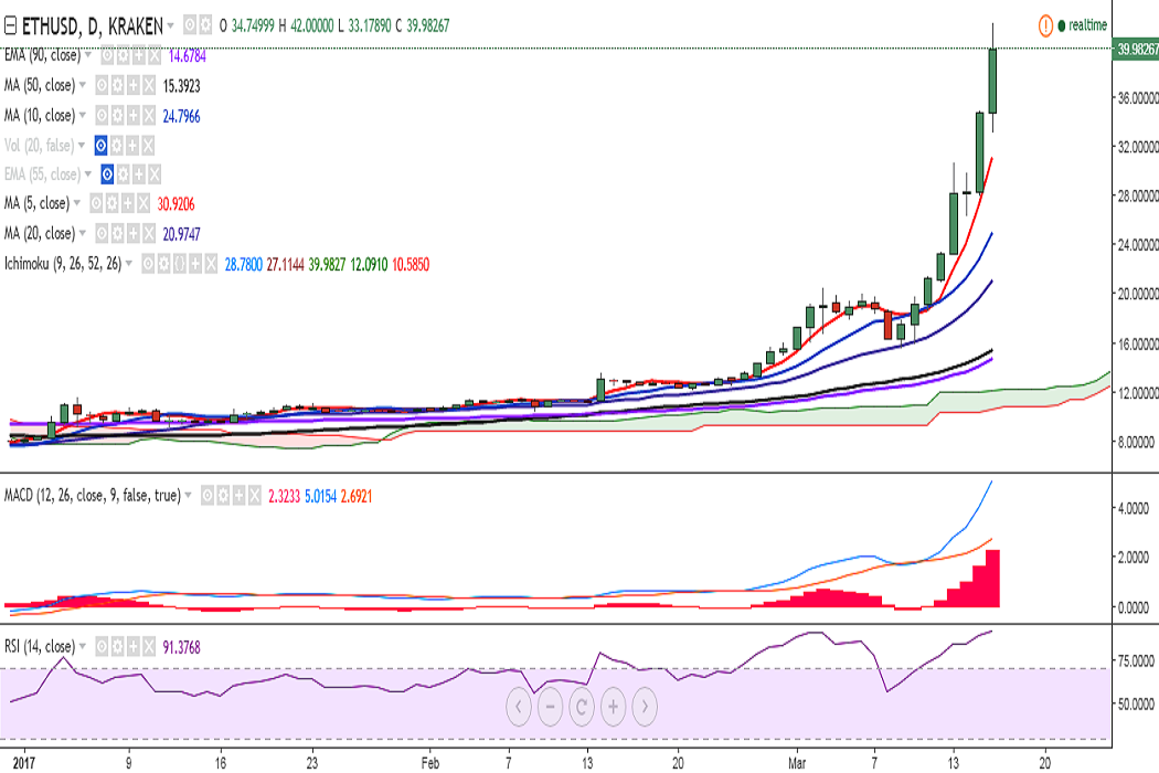 ETH/USD surged higher on Thursday and hit a fresh all-time high at 42 levels. It is currently trading at 39 levels at the time of writing (Kraken).