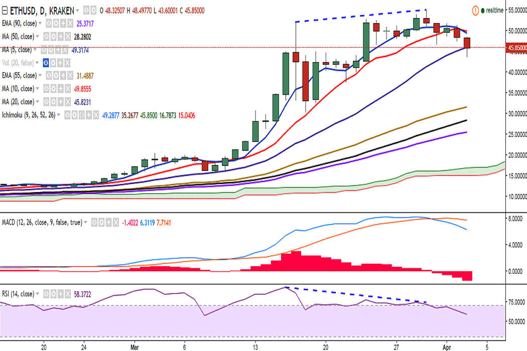 ETH/USD fell to 43.60 levels on Monday before slightly restoring its strength to above 20-DMA. It is currently trading at 45 levels at the time of writing (Kraken).