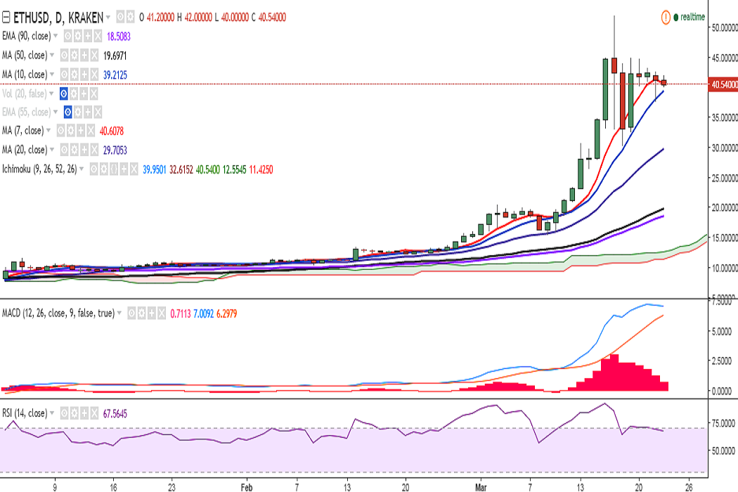 ETH/USD is trading in a tight range on Thursday between 41 and 42 levels. It is currently trading at 41 levels at press time (Kraken).