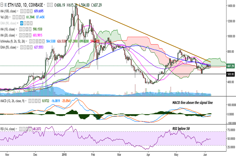 ETH/USD remains rangebound on Thursday and is trying to hold above 600 levels (Coinbase).