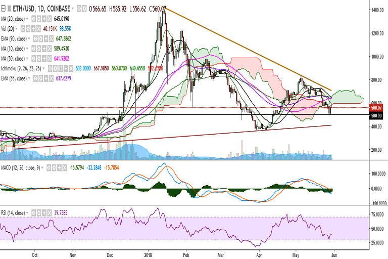 ETH/USD found strong support near 500 levels and has bounced to 585 levels. It is currently trading at 559 levels at the time of writing (Coinbase).