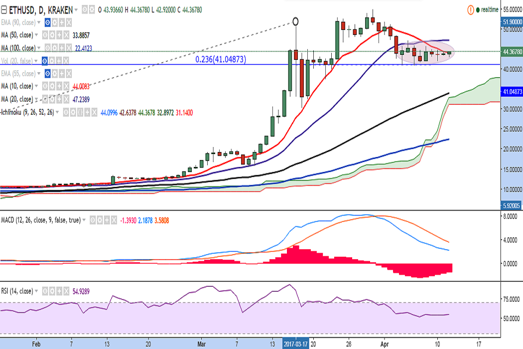 ETH/USD continues rangebound trading on Wednesday, with its upside capped by 10-DMA. It is currently trading at 44 levels at the time of writing (Kraken).