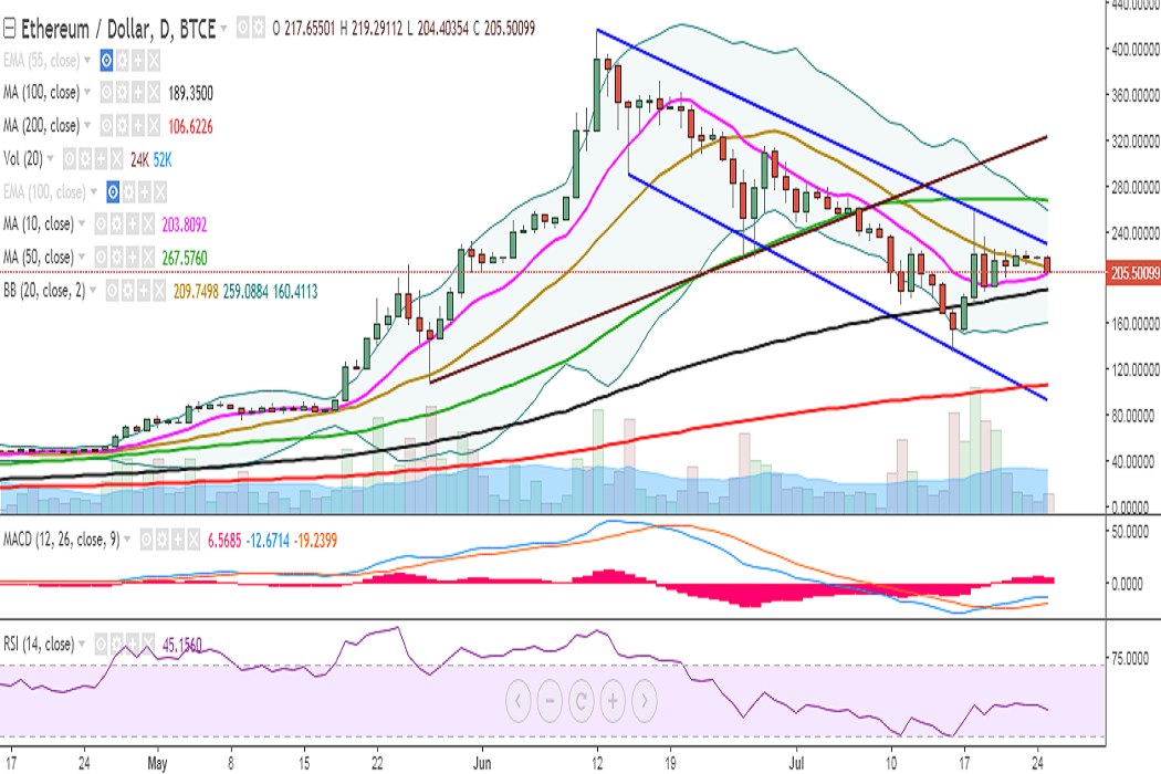 ETH/USD continues trading in a tight range on Tuesday and is trying to hold above the 200 mark. It is currently trading at 205 levels at the time of writing (BTC-e).