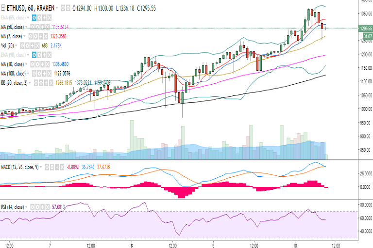 ETH/USD surged to a fresh all-time high at 1366 levels earlier in the day and is hovering around 1300 levels at the time of writing (Kraken).