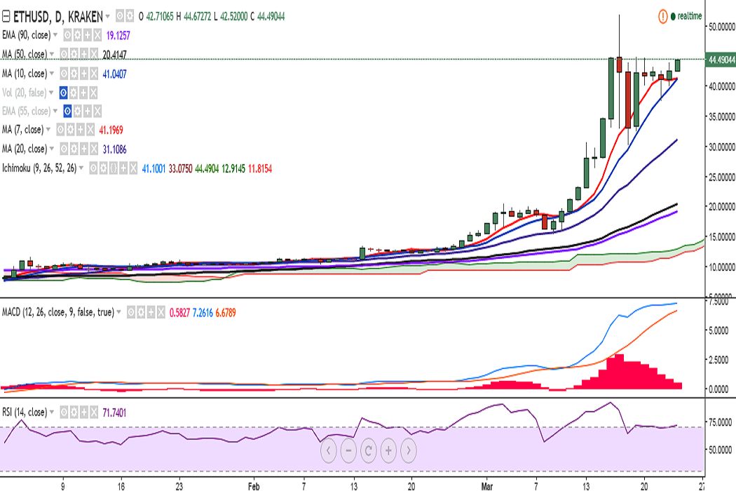 ETH/USD is consolidating in a narrow range between 42 and 45 levels on Friday. It is currently trading at 43 levels at press time (Kraken).