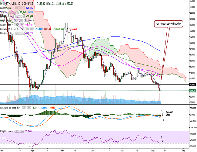 ETH/USD dropped to 347 levels on Wednesday before closing at 355 levels (Coinbase).