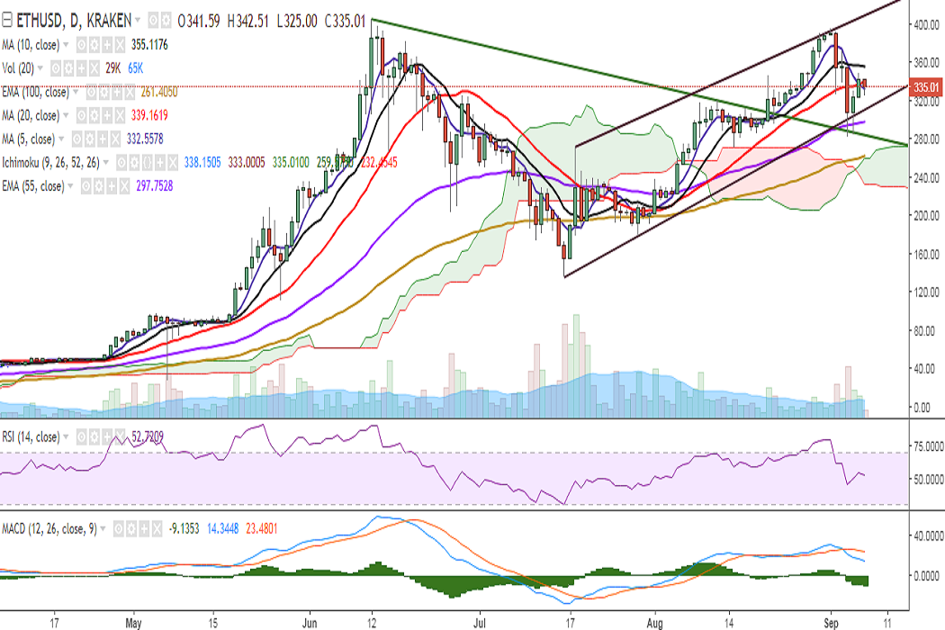 ETH/USD is trading in a narrow range on Thursday as it stopped short of 10-DMA on September 06. It is currently trading at 335 levels at the time of writing (Kraken).