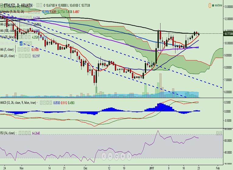 ETH/USD broke above 200-DMA and hit a high of 11 levels on January 21. However, it is struggling to hold its strength above this level and is currently trading at 10.77 levels at press time (Kraken).