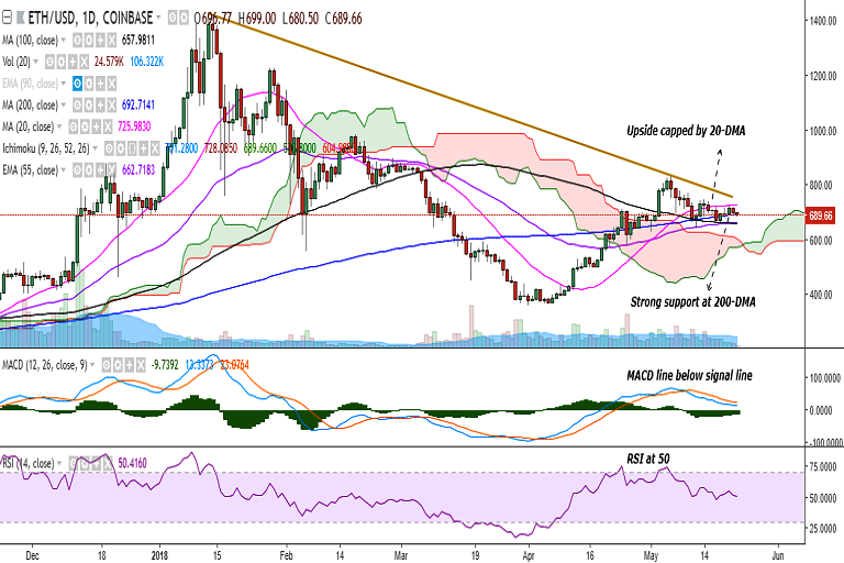 ETH/USD continues to trade in a close range on Tuesday with its upside capped by 20-DMA. It is trading well below 700 levels at 687 levels at the time of writing (Coinbase).