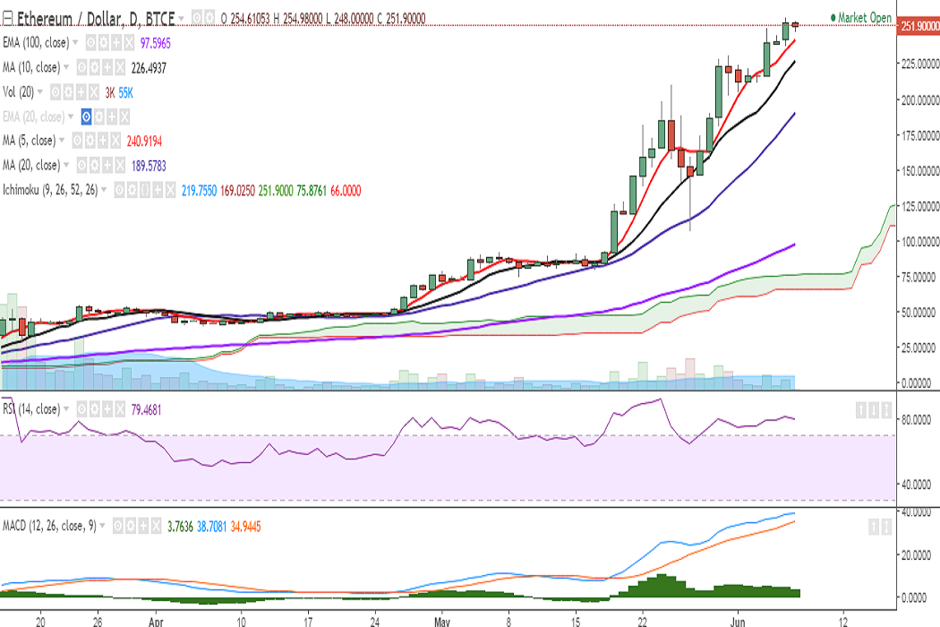 ETH/USD is trading in a narrow range on Wednesday after it hit a fresh all-time high at 258 levels on June 06. It is currently trading at 251 levels at the time of writing (BTC-e).