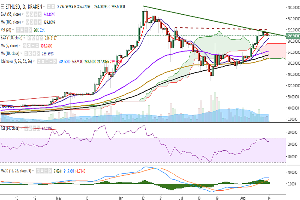 ETH/USD closed below 5-DMA on August 13 after it hit 320 levels the previous day. The pair is currently trading in an extremely narrow range and hovering around 300 levels at the time of writing (Kraken).