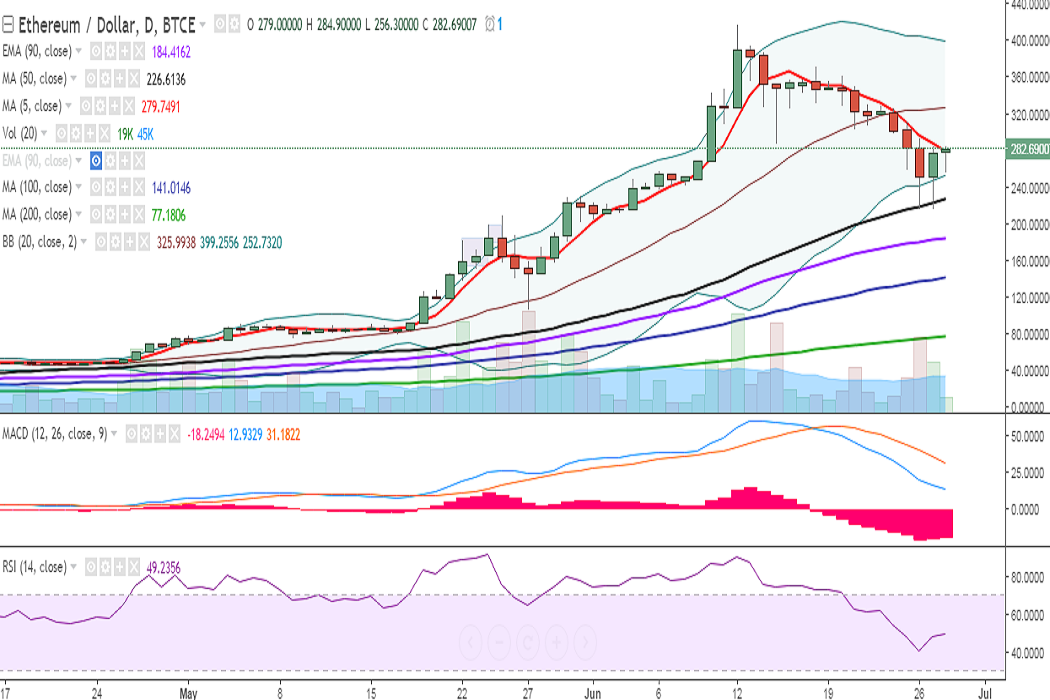 ETH/USD turned green after it hit a low of 217 levels on Tuesday and closed at 284 levels. It is currently hovering around 5-DMA at 284 levels at the time of writing (BTC-e).